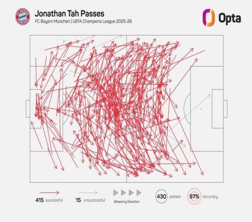 据Opta统计,约纳坦-塔本赛季欧冠至今尝试了430次传球,415次成功,15次失败,传球成功率高达97%,这位拜仁后卫是本赛季欧冠至今传球成功率最高的球员。