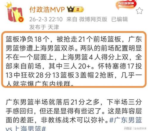 赛后,媒体人付政浩MVP社媒发文表示:篮板净负18个,被抢走21个前场篮板,广东男篮惨遭上海男篮双杀。两队的前场配置明显不在一个层面上,上海男篮4人得分上双,全部来自前场,其中三人20+,怀特塞德28分15篮板3盖帽2抢断,几乎一人就完爆广东内线群……