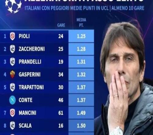 场均1.37分,执教至少10场欧冠的意大利教练中孔蒂成绩倒数第5 -